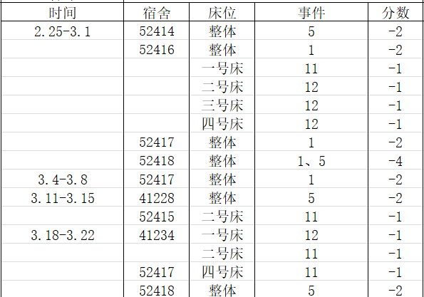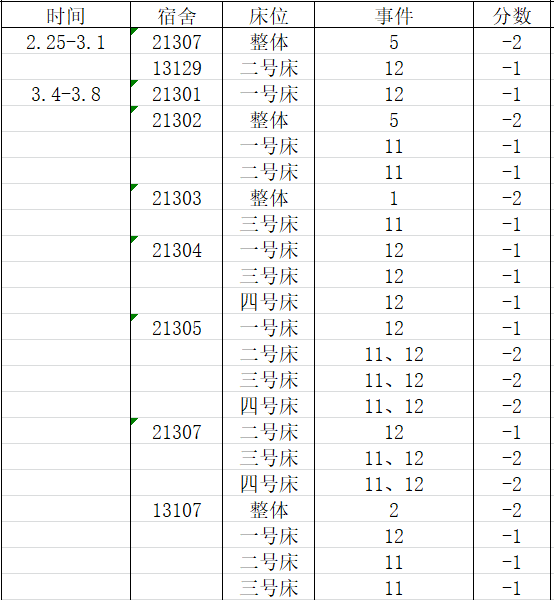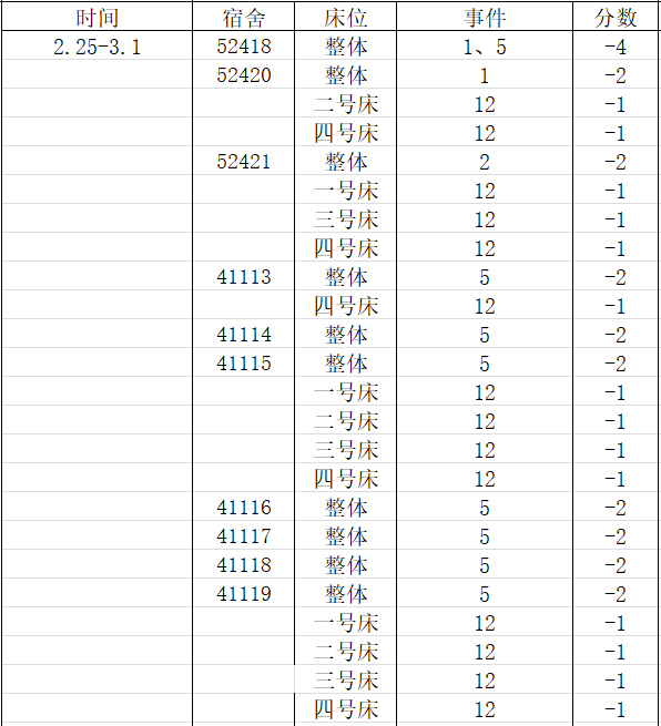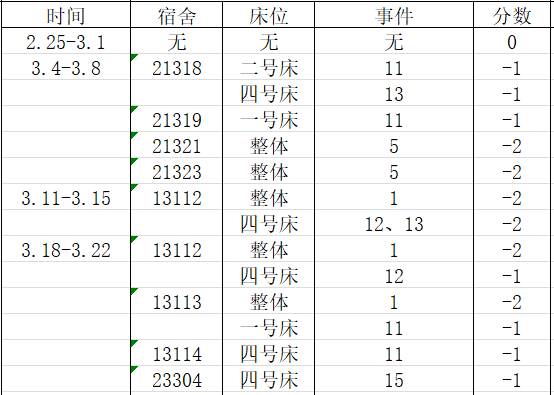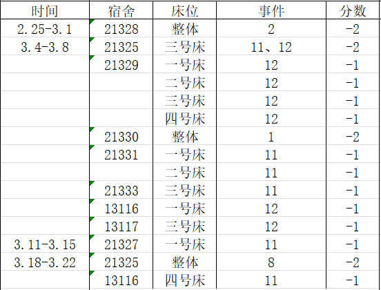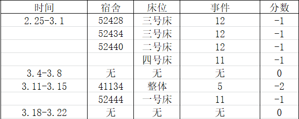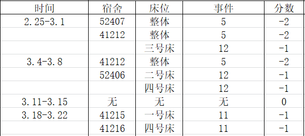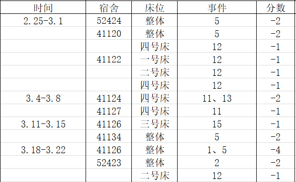 宿舍卫生方面,17级经济统计学1701班宿舍13129,统计学1701班宿舍13121、13125扣分严重;18级经济统计学1801班宿舍52404,统计学1802班宿舍41126扣分严重,请相应班级的班团注意。