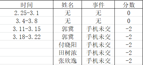 课堂表现方面17级无旷课迟到现象;18级经济统计学1802班付茂玉未交手机,统计学1801班郭冀、付晓阳、田树浓、张欣逸未交手机,请引起重视。