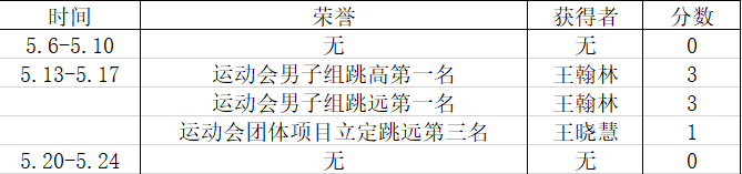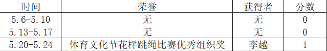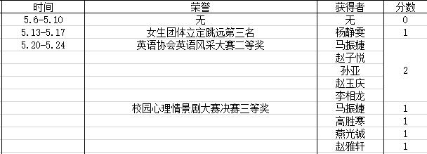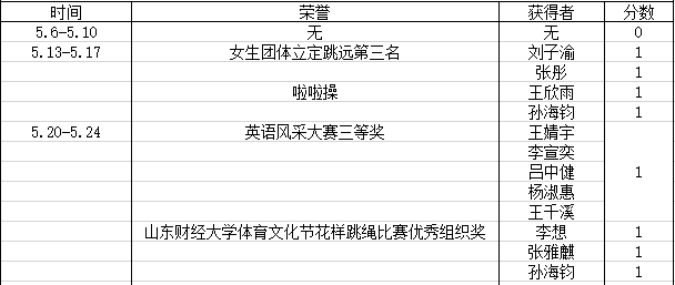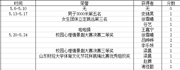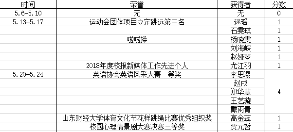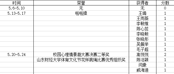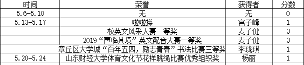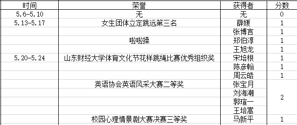 荣誉获得方面,我院荣获山东财经大学体育文化节花样跳绳比赛优秀组织奖以及山东财经大学第八届校园心理情景剧大赛决赛二等奖、三等奖;上周英语协会举行班级活动英语风采大赛,各班在比赛中中所获荣誉在表格中体现。