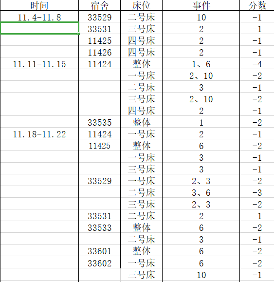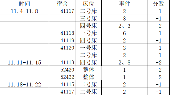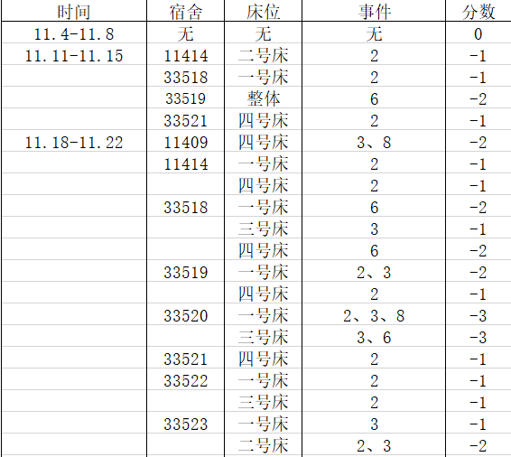 宿舍卫生情况:第一名100分