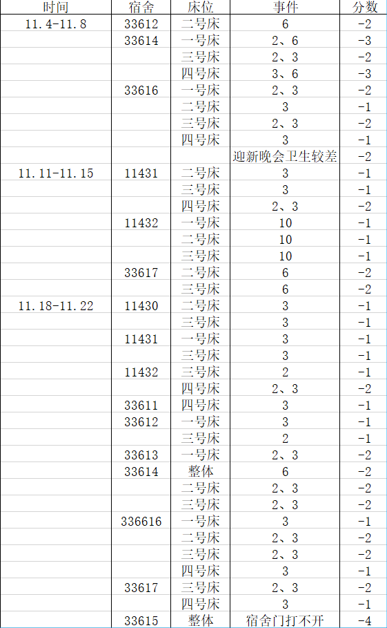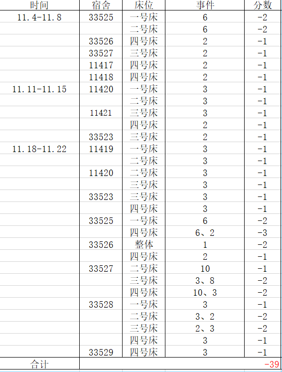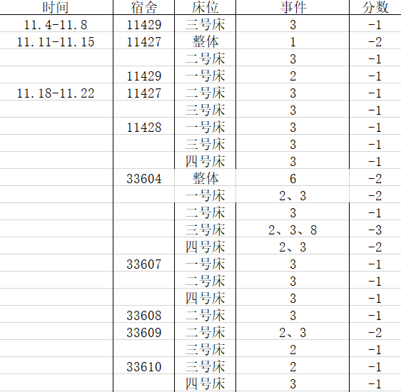 宿舍卫生方面,经济统计学1802、经济统计学1804、数据科学与大数据技术1801、统计学1902、统计学1901表现较好,19级其他班级表现较差,其中经济统计学1901与数据科学与大数据技术1902混合宿舍33529扣分严重、经济统计学1902宿舍33604扣分严重。希望其他扣分较多的相应班级注意并引起重视。