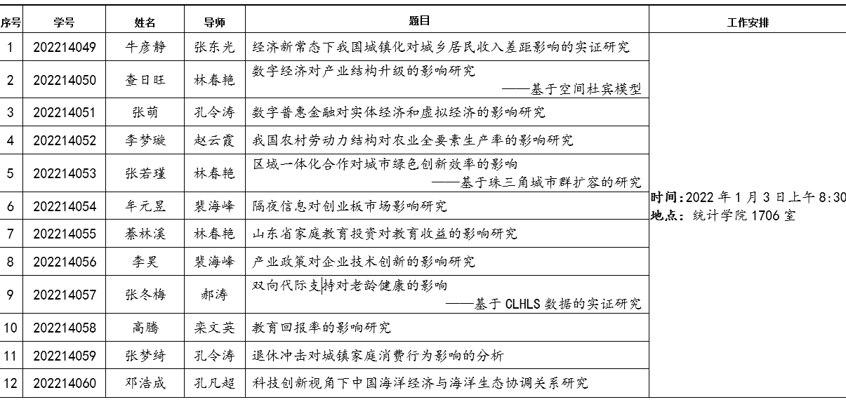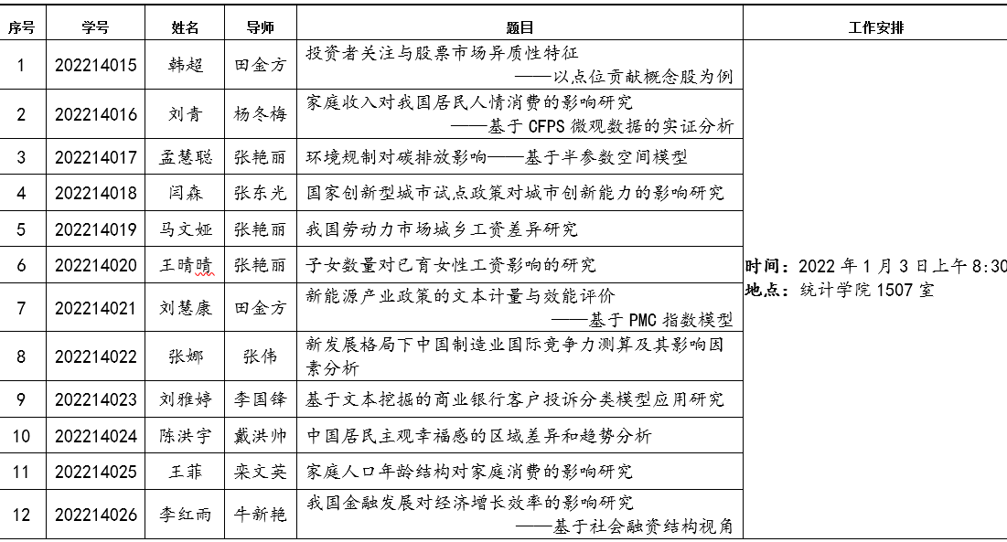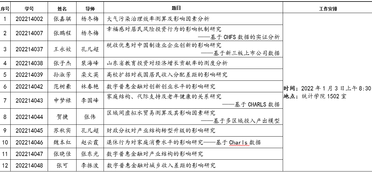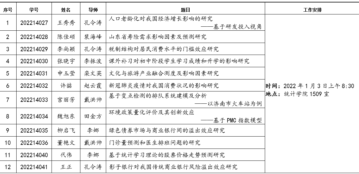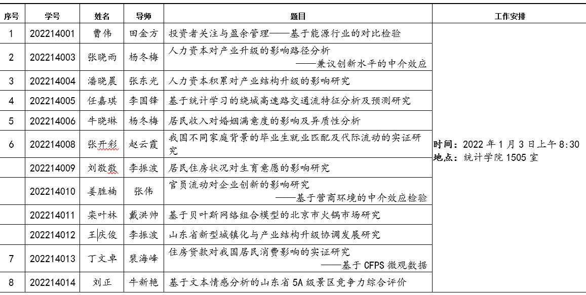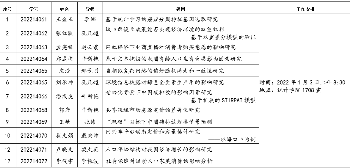 三、统计学院定于2022年1月3日上午进行2022届专业型硕士研究生预答辩,具体时间地点见附件;