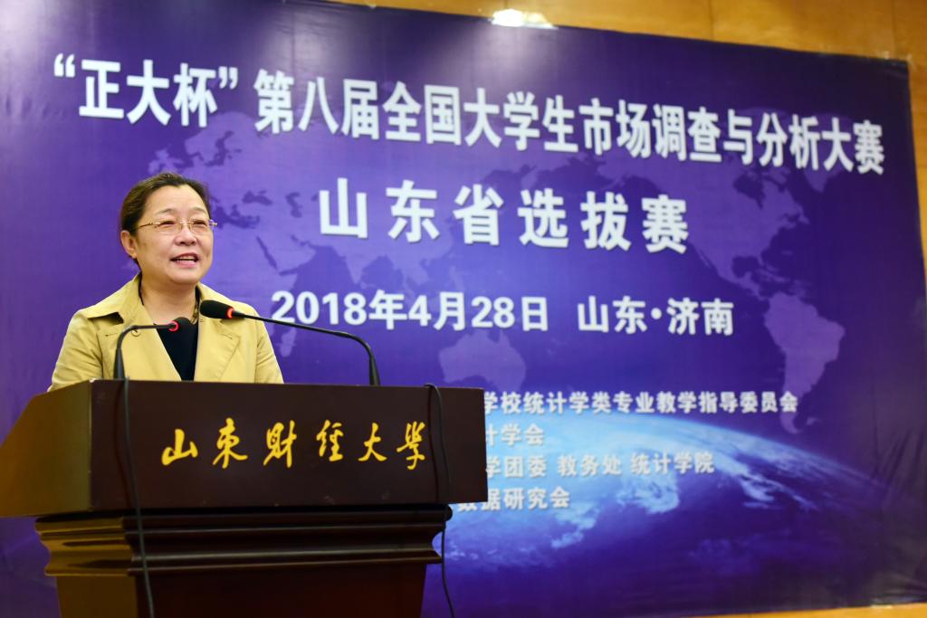陈晓兰首先指出在我校面临重要转型与空前发展机遇的背景下,举办“‘正大杯’第八届全国大学生市场调查与分析大赛山东省选拔赛”意义重大,是提倡、发展、践行实践教学理念的有效途径和抓手;紧接着陈晓兰对我校的发展历程与学科建设进行了回顾与展望,并重点指出在统计学学科团队与其他相关学科同仁的共同努力下,统计学学科近几年取得了不错成绩,2018年获得统计学一级学科博士学位授予权,数据科学与大数据本科专业获批设立,2016年教育部第四轮学科评估中取得C+成绩,这些成绩为统计学学科未来的发展奠定了良好的发展基础与平台支撑,希望并相信统计学学科全体成员能够把握住这一难得的发展机遇,继续奋发图强,在学科建设的道路上更上一层楼;最后陈晓兰表示本次大赛为省内学界、政界、业界的专家学者共同探讨高校实践教学大计提供了平台,希望所有同仁以本次赛事为契机,进一步增进对山东财经大学的了解,对学校的发展建设多提宝贵意见和建议,与学校开展多种形式的交流与合作,促进学校相关学科的发展,推动学校高水平大学的建设。