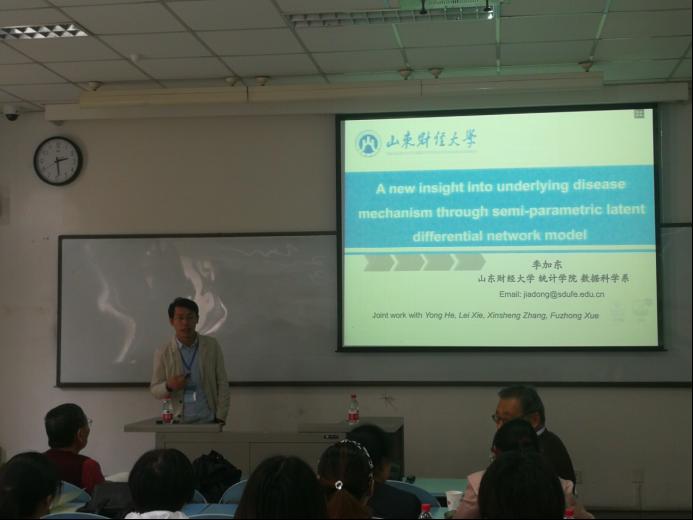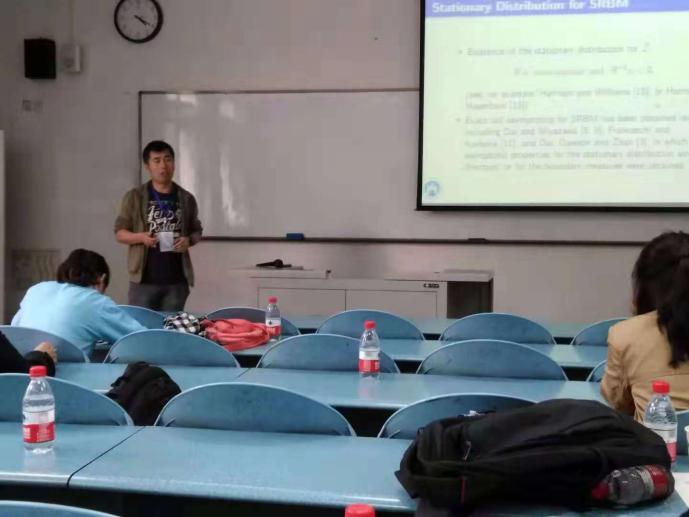 我院派出数理统计系的戴洪帅、何勇、季加东、于渊、孔令涛、郝涛等六位教师代表参加了此次会议。会议期间,戴洪帅老师做了题为“Stationary Distributions for Two-Dimensional Sticky Brownian Motion: Exact Tail Asymptotics and Extreme Value Distributions”的报告,何勇老师做了题为“Doubly Robust Sure Screening for Elliptical Copula Regression Model”的报告,季加东老师做了题为“A New Insight into Underlying Disease Mechanism Through Semi-parametric Latent Differential Network Model”的报告。