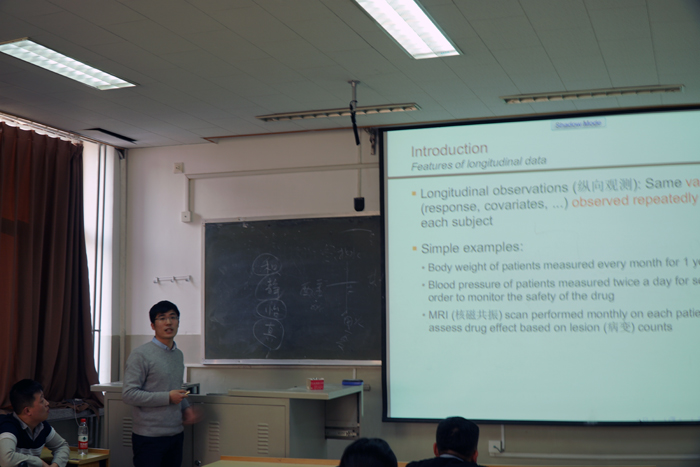 裴有权博士的报告主题为“Statistical inference for multivariate longitudinal data with irregular auto-correlated error process”。报告从最简单的纵向数据类型出发,拓展讲解了纵向数据与面板数据的区别,开阔了研究生们的视野;报告展示了多维响应变量纵向数据问题,其数据结构之复杂程度让在场的研究生们惊叹。由于纵向数据本身的复杂性,加之多维响应变量结构,致使该类数据的统计建模与分析更为复杂。针对多维响应变量问题,统计学家们不得不考虑各个相应变量之间的相关性结构,而纵向数据本身观察时间的非齐次性,使得该相关性的刻画相当困难。裴博士从自回归相关性和可加性方差结构出发,首先建立其多维响应变量纵向数据统计模型,并利用两步加权最小二乘估计方法给出该类模型估计算法;其次给出判定响应变量之间是否独立的假设检验,最后通过惩罚方法给出自回归阶数的估计,通过数值模型和欧洲造纸行业数据展示了其统计建模和估计精度及其预测的效果。
