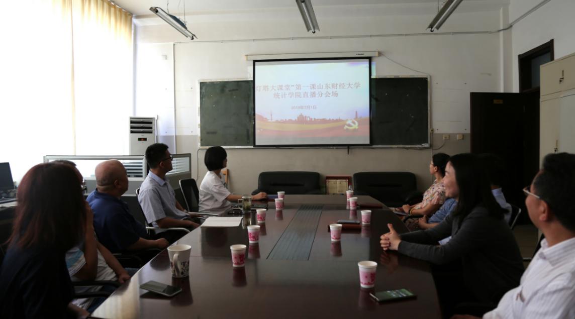 2019年7月1日,在党的98岁生日之际,山东财经大学统计学院党委在学院会议室1502设立分会场,组织师生党员集中观看“灯塔大课堂”第一课。学院党委委员、部分教师党员代表和学生党员代表到场观看。