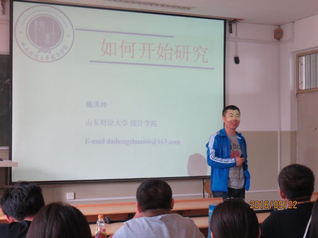 9月22日上午八点三十分,统计学院组织的研究生论文研究专题讲座在燕山校区1505进行,主讲人为山东财经大学统计学院副教授戴洪帅,本次报告的主题为“如何开始研究”。报告由张建老师主持,2016届全体研一学生参加了此次讲座。