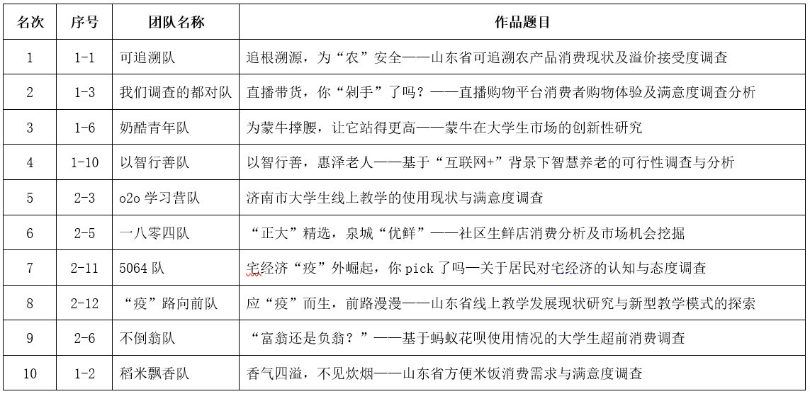 经评议,推荐选拔赛一等奖的前8名队伍参加“第十届全国大学生市场调查与分析大赛”山东省省赛。