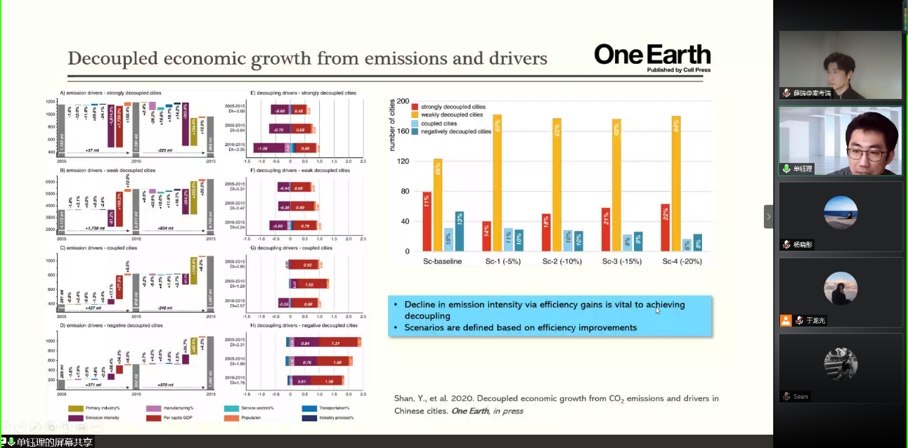 报告伊始,单钰理老师指出碳排放是环境气候变化问题研究中的热点问题之一,以目前的碳排放核算清单现状引出自己团队核算的碳排放数据集(CEADs),并梳理了国家和省级碳排放数据的可行性研究。随后,单老师以“少量的、特别的几个城市贡献了绝大多数的碳排放”的数据事实为依据,重点探究城市维度的碳排放,提出不同城市在产业链上扮演着不同的角色,还额外指明了目前经济发展与碳排放脱钩的现状,作为进一步研究方向。紧接着,单老师借助外卖行业污染案例介绍了不同区域间的差异,并提出“共享餐具”方案,具有较高的经济社会价值。最后,针对突发的COVID-19事件对世界碳排放的影响,单老师深入探讨了为应对COVID-19所采取的相关政策对于达成气候目标是否有所帮助,并以灯光亮度数据为例,说明COVID-19发生前后的碳情况。