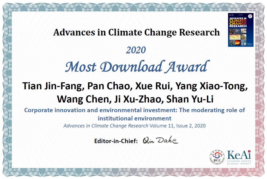 田金方教授及其合作者在期刊《Advances in Climate Change Research》(Volume 11, Issue 2, 2020)上发表的学术论文“Corporate innovation and environmental investment: The moderating role of institutional environment”,获得2020年度期刊“高下载论文奖”。该期刊是中科院SCI分区二区期刊。最新影响因子3.967,为我校A1类期刊。