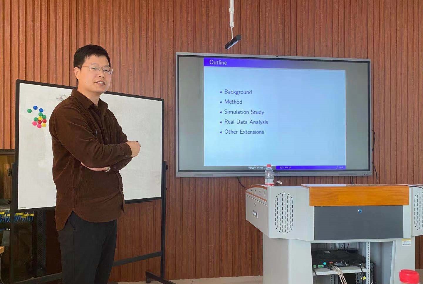 报告会上,王鹏飞博士从大规模多重检验的在现实中的应用背景展开,详细介绍了前人的理论成果并总结出了关于大规模多重检验问题处理的一般思路,最后给出了一种相比于前人更加准确的检验方法。
