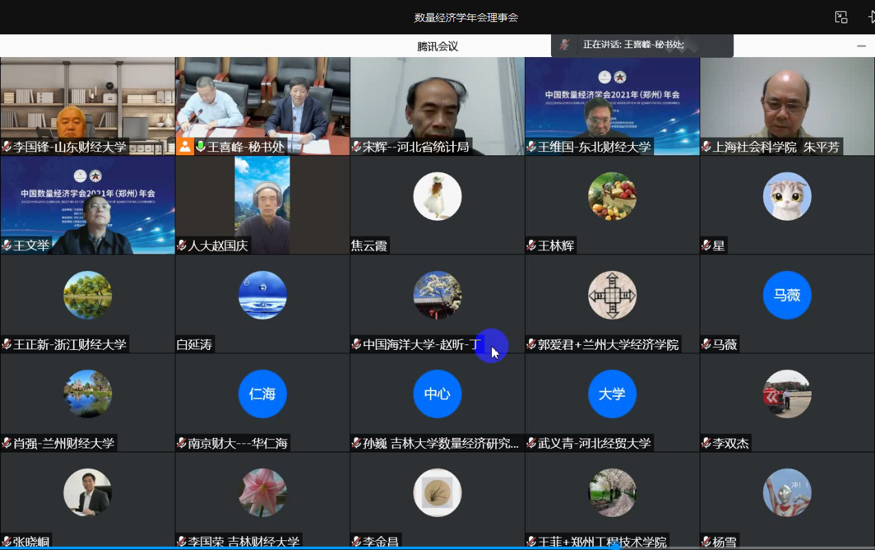 20211022-24日,由中国数量经济学会和郑州大学联合主办、郑州大学商学院承办、《数量经济技术经济研究》杂志社和中国社会科学院宏观经济研究智库协办的中国数量经济学会2021年(郑州)年会,因疫情原因以线上会议形式成功举办。来自中国社会科学院等科研院所以及清华大学、北京大学、中国科学院大学、中国人民大学、吉林大学等百余所高等院校1500多位专家和青年学者在线参会。