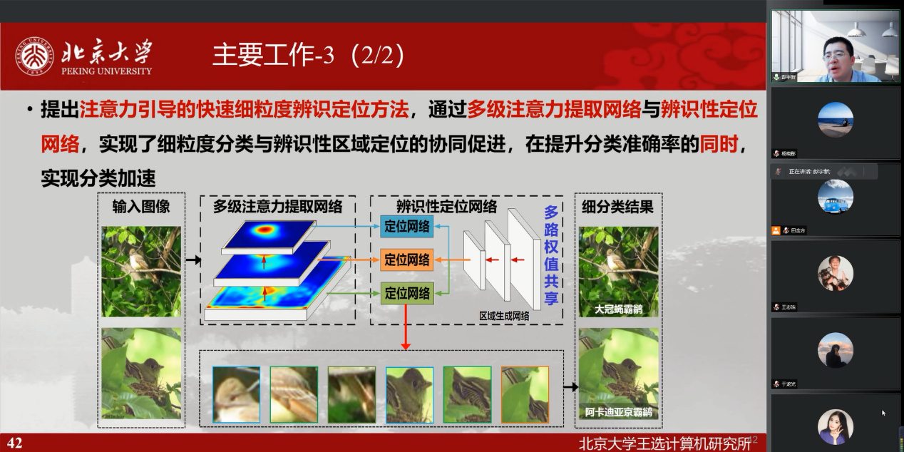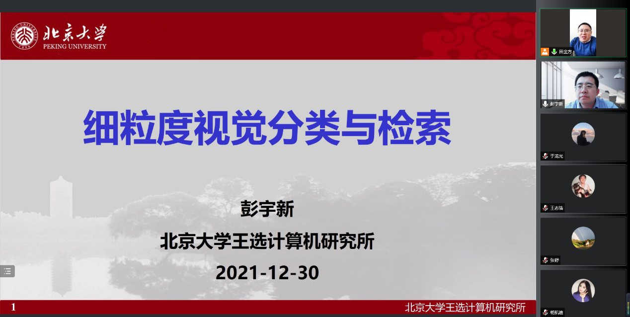 12月30日下午,统计学院“百脉大讲坛”第104讲通过腾讯会议线上平台顺利举行。北京大学二级教授、博士生导师彭宇新教授应邀做客本次讲坛,并做了题为“细粒度视觉分类与检索”的学术报告。报告会由统计学院副院长田金方教授主持,学院部分教师、博士和硕士研究生通过腾讯会议客户端参与了本次学术活动。
