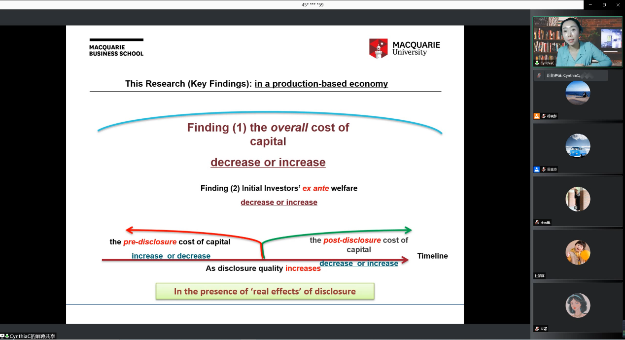Cynthia Cai老师结合理论模型与实际案例,与大家一起探讨了在生产经济存在披露的“实际影响”的情况下,信息披露与不同时间段相关融资成本之间的关系。首先,Cai老师以中国恒大企业的信息披露为案例,介绍了本报告的研究背景,并引出企业的信息披露是否会影响其融资成本这一问题。随后,在辨析理论分析与实证分析之间的关系后,利用时间线的可视化形式展示了以往相关研究主题的故事线。紧接着,Cai老师讲解了研究所用的理论模型,并重点介绍了文章的几点关键发现,例如,在生产型经济体中,企业信息的披露质量对整个时间线的融资成本是存在影响的。最后,Cai老师总结了研究发现背后所隐含的影响机制以及经济学意义,逻辑清晰,内涵深刻。
