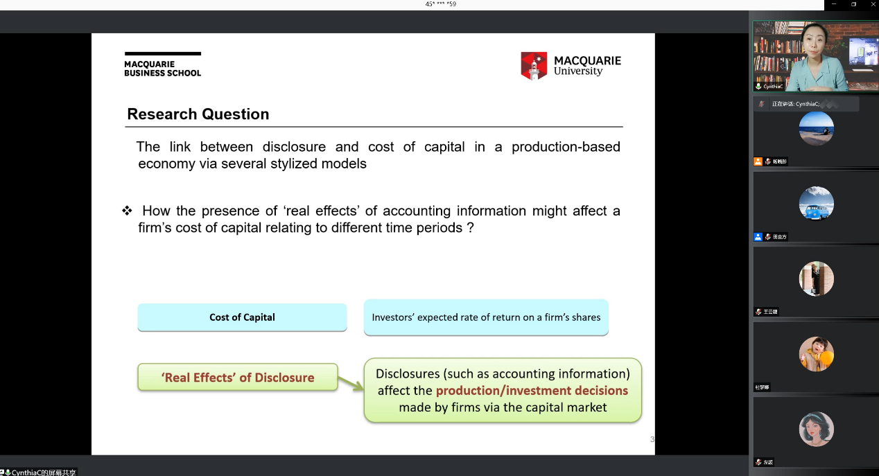 12月30日下午,统计学院“百脉大讲坛”第105讲通过腾讯会议线上平台顺利举行。麦考瑞大学高级讲师Cynthia Cai博士应邀做客本次讲坛,并做了题为“A Real Effect Across Time: Disclosure Quality, Cost of Capital, and Profitability”的学术报告。本场报告会由副院长田金方教授主持,学院部分老师、博士及硕士研究生参与了此次交流。