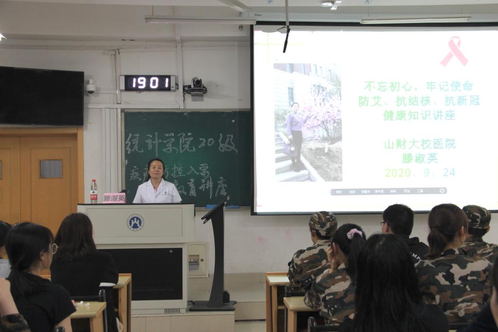 为了普及卫生防疫安全知识,进一步控制新冠疫情发展,使大一新生更好地适应大学生活,我院于2020年9月24日晚上7点在5130教室组织了新冠肺炎、艾滋病、肺结核防治讲座,本次讲座由校医院副院长滕淑英主讲,统计学院2020级新生参加,本次讲座采取线上线下同步的方式进行。