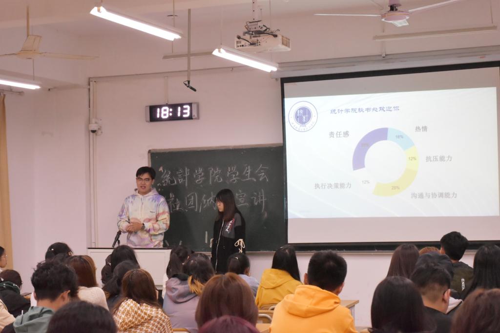 为使新生对我院学生会有进一步了解,同时也为招贤纳士,使更多能力突出的同学加入到学生会中,2020年10月4日下午18:00,统计学院于圣井校区5334、5336、5338、5340四个教室举行了学生会宣讲活动。20级全体新生以及19级学生会参加了此次宣讲会。
