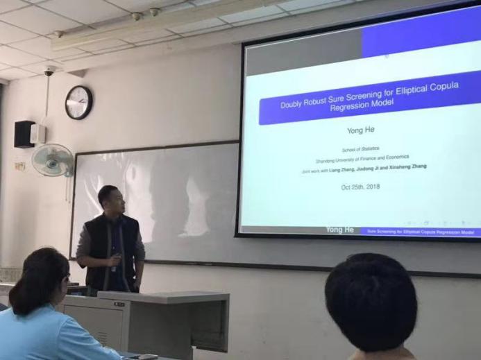 我院派出数理统计系的戴洪帅、何勇、季加东、于渊、孔令涛、郝涛等六位教师代表参加了此次会议。会议期间,戴洪帅老师做了题为“Stationary Distributions for Two-Dimensional Sticky Brownian Motion: Exact Tail Asymptotics and Extreme Value Distributions”的报告,何勇老师做了题为“Doubly Robust Sure Screening for Elliptical Copula Regression Model”的报告,季加东老师做了题为“A New Insight into Underlying Disease Mechanism Through Semi-parametric Latent Differential Network Model”的报告。