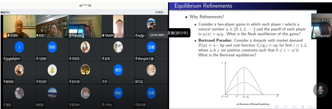 本次线上讲座分三个专题进行。Theorist博士从:(1)博弈论及发展历程;(2)博弈论及一般均衡理论;(3)博弈论与产业经济理论等三个方面的专题,通过典型文献示例和风趣的历史故事,为师生们详细讲解了非合作博弈论、合作博弈论的基本思想、概念原理、发展历程以及其与一般均衡理论、产业经济学理论之间的渊源关系及其应用。讲座深入浅出,师生们深受启发,积极参与讨论,并相约Theorist博士针对演化博弈论前沿理论继续展开研讨。