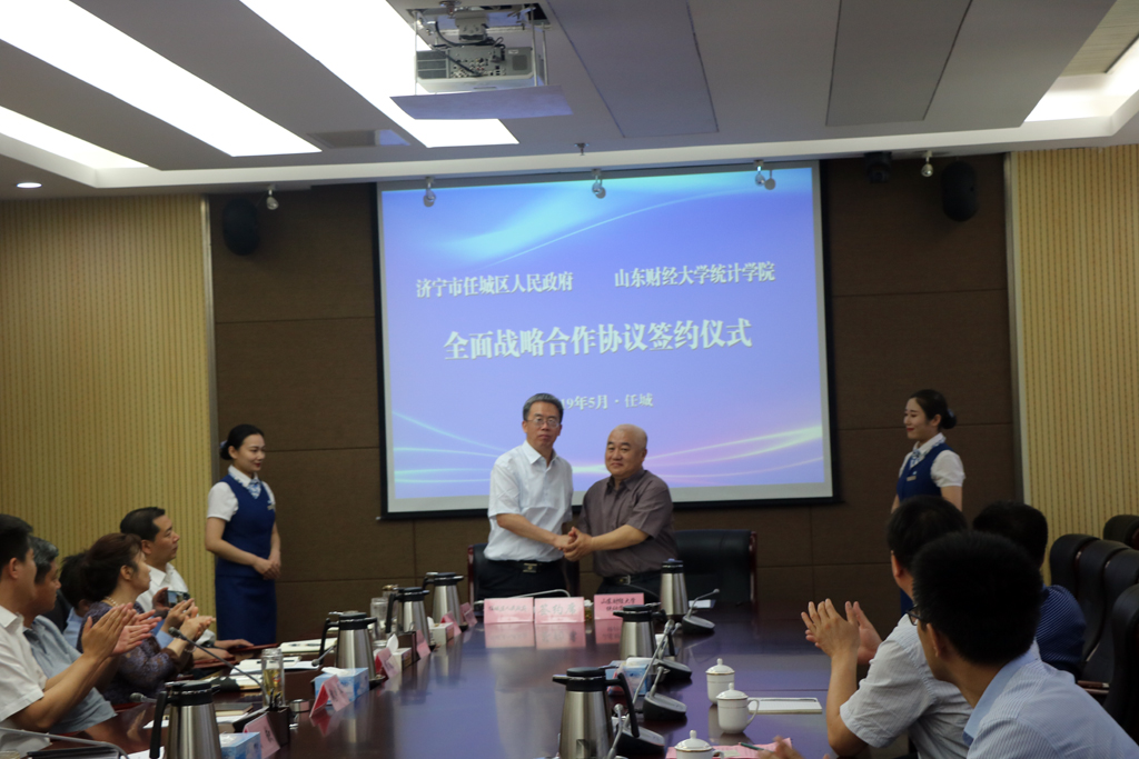 5月23日,统计学院党委书记郑磊、执行院长李国锋、副院长裴海峰、校合作发展处副处长邵伟然一行4人赴济宁市任城区开展学习交流,签署战略合作协议。济宁市统计局副局长魏中齐、任城区委常委、常务副区长胡钦出席签约仪式,区相关部门负责人及统计局有关人员参加,区统计局党组书记、局长周超主持签约仪式。