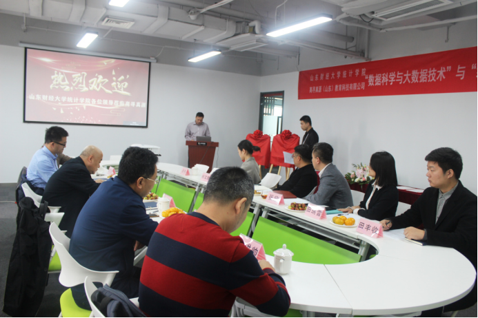 为进一步强化校企合作办学,推动产学研深度融合2020年10月16日,山东财经大学统计学院高寻真源(山东)教育科技有限公司举办关于“数据科学与大数据技术”“统计学专业”校企合作签约仪式山东财经大学统计学院党委书记郑磊、院长李国锋、党委副书记赵世民、副院长裴海峰、实验室主任任文东、数理统计系主任戴洪帅以及高寻真源(山东)教育科技有限公司执行董事张欣、副总经理韩帅副总经理徐冉运营管理中心经理田瑞雪、技术研发中心主管田丰收、售前工程师杨文雅等参加了此次签约仪式。仪式由高寻真源(山东)教育科技有限公司副总经理徐冉主持